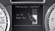 Active Parking Assist makes a major contribution to safe and comfortable driving. It helps drivers find a suitable parking space for parallel parking and helps them to park by active steering intervention. The integrated PARKTRONIC can warn drivers if there are hidden obstacles in front of or behind the car. Active Parking Assist uses two ultrasonic sensors in the front bumper to identify suitable parking spaces when the vehicle is travelling at up to 36 km/h. The automatic parking space search function is indicated by a "P" symbol in the instrument cluster. If Active Parking Assist has found a parking space, an arrow appears next to the "P". By default, Active Parking Assist searches for parking spaces on the right-hand side of the road. If the indicator on the driver's side is active, parking spaces on the left-hand side are also detected