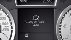 The ATTENTION ASSIST function is particularly helpful on long journeys and when driving at night; the system warns the driver if it detects signs of failing attention and increasing weariness. This driving assistance system can warn the driver when it identifies typical signs of fatigue, which in turn improves handling safety. ATTENTION ASSIST continuously analyses driving behaviour and steering movements. If the system detects certain steering patterns that frequently accompany drowsiness, it warns the driver visually by displaying the "coffee cup" symbol in the instrument cluster at the same time as emitting audible signals. ATTENTION ASSIST can be activated and deactivated in the main menu of the instrument cluster under "Assistance systems". When switched on, it is active at speeds between 80 and 180 km/h.
