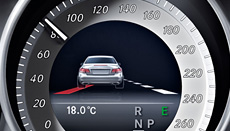 The Parking package helps the driver in tight parking and manoeuvring situations and comes with an innovation: A 360-degree camera system displays the vehicle's surroundings from a bird's-eye perspective on the screen of the COMAND Online multimedia system. Monitoring all four sides of the vehicle makes it easier to judge all manoeuvring situations. It can warn drivers visually and audibly of obstacles in front of and behind the vehicle, helping to prevent damage when manoeuvring. This includes: Active Parking Assist Active Parking Assist uses six ultrasonic sensors in the front bumper and six in the rear bumper to identify suitable parking spaces when the vehicle is travelling at speeds between 0 and 35 km/h. The automatic parking space search function is indicated by a "P" symbol in the instrument cluster. If Active Parking Assist has found a parking space, an arrow appears next to the "P". By default, Active Parking Assist searches for parking spaces on the right-hand side of the road. If the indicator on the driver's side is active, parking spaces on the left-hand side are also detected The driver starts the parking manoeuvring process by stopping ahead of the indicated parking space, selecting reverse and confirming the prompt which appears in the instrument cluster. Active Parking Assist steers up to a speed of 10 km/h. The driver only operates the accelerator and the brake pedal. The parking manoeuvre is completed in a maximum of 5 moves. The final parking move is indicated by the message "Parking Assist complete" in the display. This message is accompanied by an acoustic signal.< For the first time the E-Class furthermore offers the functions automatic parking and leaving a parking space with active steering and brake intervention as well as an additional lateral protection against obstacles located to the sides. PARKTRONIC: The system gives visible and audible signals to warn of obstacles it detects in front of the vehicle and behind. It is active up to a speed of about 18 km/h.