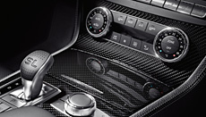 The AMG carbon fibre trim elements on covers and stowage compartments of the centre console and the trim strips in the door armrests continue in the vehicle interior additional sporty highlights, providing a Formula-1 flair.