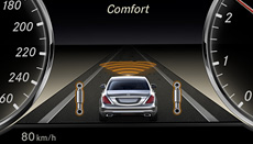 This system makes parking and manoeuvring with a realistic all-round view possible with the help of four networked cameras. The vehicle and its surroundings can be shown in a bird's-eye view on the COMAND Online display, and obstacles below the window line are also visible to the driver. The system also provides the following assistance: