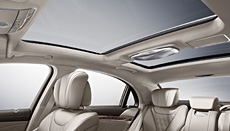 Panoramic sliding sunroof (optional) With its large glazed areas, this roof system ensures a particularly bright and welcoming ambience in the interior. It consists of a fixed panoramic glass rear section and an electrically operated sliding glass front section for ventilation of the interior as required. When the roof is open, the interior can be naturally ventilated to suit individual requirements using different opening positions. A net-like wind deflector keeps disturbing turbulence out and keeps the noise level pleasantly low. Two-part roller sun blinds in the appointments colour can be closed using one-touch control if the sun is shining in too brightly.